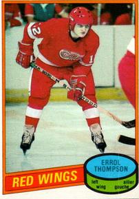 The 1976-77 season was marred by a broken arm which limited Errol to 41 games, but he managed 21 goals and 37 points. He did enjoy a big night against Chicago with a hat trick in a wild 10-8 win over Chicago but a year later he was dealt to Detroit for hard-nosed forward Dan Maloney in what appeared to be a deal that favoured the Red Wings. Toronto dealt away two first round picks and second round pick along with a 40-goal scorer for essentially muscle. Leaf head coach Roger Neilson was critical of Thompson’s offense-minded play so the thus the deal transpired. The trade came in March, 1978. The Leafs made the semi-finals but swept by the Canadiens. It easily could have been one of the worst trades ever except the two first round picks to the Wings didn’t pan out. Errol finished the season in Detroit with 22 goals and 45 points. He would score 23 goals and 34 in each of the next two years in the Motor City and was named captain of the Wings in 1980-81.